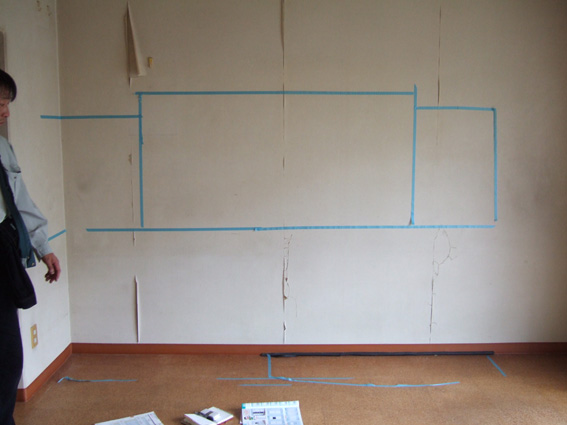 打ち合わせ中です。紙テープでお客様にイメージを作ってもらいます。